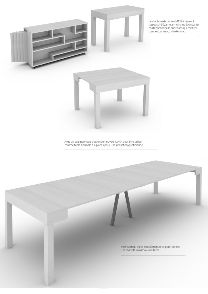 Table console extensible au design contemporain, composée de 5 rallonges incorporées de 50 cm chacune, choix d’extension à partir d’ une rallonge de 50 cm. Équipée d’un mécanisme télescopique avec roulements à billes en acier et de pieds central de soutien a cacher. Nombre de couverts maximum: 12 couverts. Finition en bois plaqué en plusieurs coloris. Meuble optionell laqué lisse même couleur que la table ou des combinaisons différentes.
